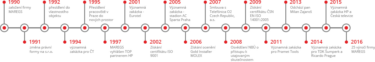 MAREGS spol. s r.o. je elektromontážní firma s tradicí od roku 1990. Zajišťujeme komplexní služby v oblasti silnoproudých a slaboproudých elektroinstalací. Od založení společnosti se věnujeme též instalacím vláknové optiky. V oblasti úspor energie provádíme instalace zařízení na snížení spotřeby elektrické energie při osvětlení systému LightEco.